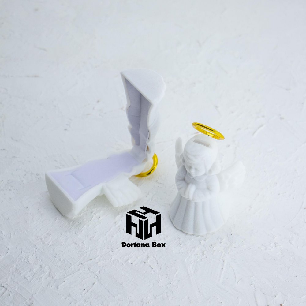 جعبه جواهر فرشته کودکانه با طراحی لطیف و رنگ سفید زیبا، انتخابی خاص برای نگهداری طلا و جواهرات کودک است. این جعبه مخملی با شکل فرشته، هدیهای جذاب برای تولد یا مناسبتهای کودکانه میباشد.