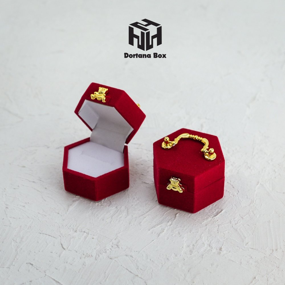 جعبه طلا کودک ششضلعی با طراحی فانتزی، روکش مخمل و دسته طلایی، گزینهای خاص برای بستهبندی و نگهداری جواهرات کودکانه است.