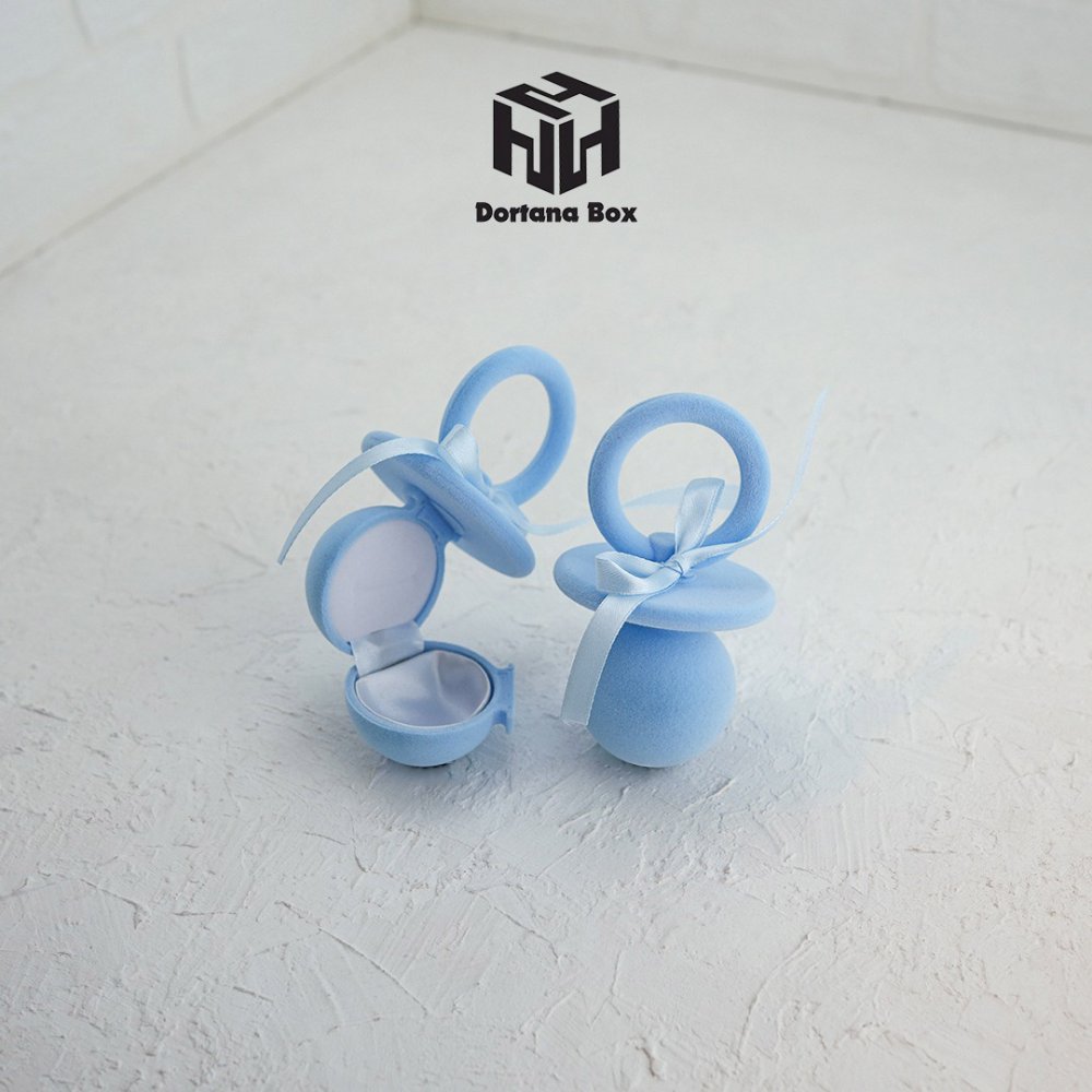 جعبه طلا کودک طرح پستانک آبی با طراحی فانتزی و جنس مخمل نرم، انتخابی خاص برای بستهبندی و هدیه دادن زیورآلات کودکانه است. این محصول جلوهای خاص و احساسی به طلا و جواهر کودک میدهد.